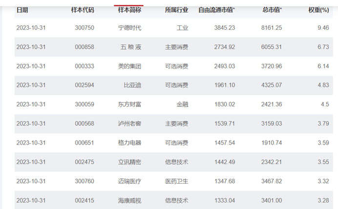 数据显示,截至2023年10月31日,该指数前十大权重股包括宁德时代、五粮液、美的集团、比亚迪、东方财富等,前十大权重股合计占比约为49.19%。(数据来源:国证指数公司,指数成份股不代表个股推荐)