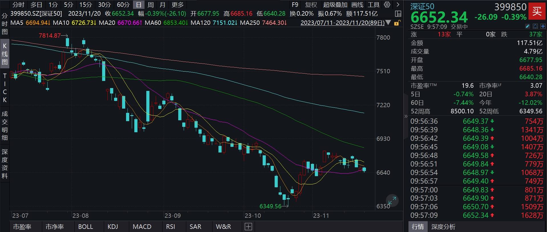 截至2023年11月20日9:57,深证50指数早盘震荡回调0.39%,报6652.34点。
