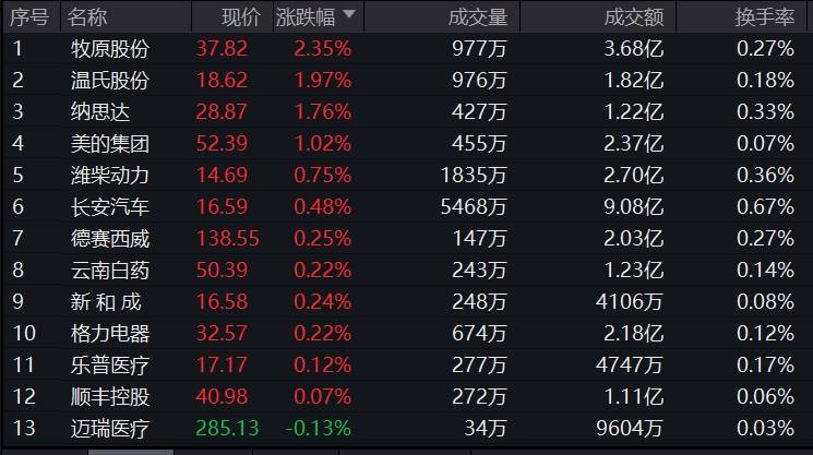 截至2023年11月20日9:57,指数成份股中,牧原股份上涨2.35%,温氏股份上涨1.97%,纳思达上涨1.76%,美的集团、潍柴动力等个股跟涨。智飞生物下跌2.52%,立讯精密下跌1.88%,三环集团、浪潮信息等个股跟跌。