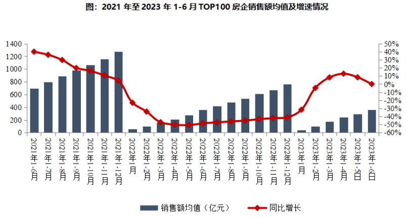 截至6月底,房企土地投资仍旧低迷。据中指研究院数据,2023年1-6月,TOP100企业拿地总额5920亿元,拿地规模同比下降10.2%,降幅较上月增加1.84个百分点。同时,TOP100门槛值也同比下降,去年为20亿元,今年减少3亿元至17亿元。