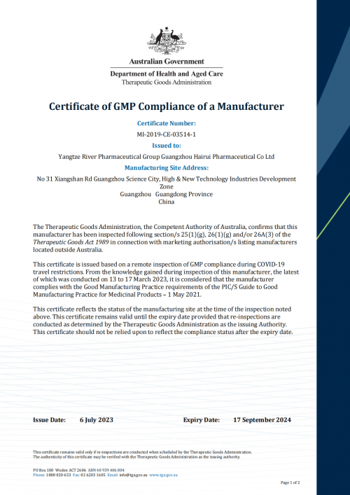 7月6日,扬子江药业集团广州海瑞药业有限公司(以下简称“海瑞药业”)冻干粉针剂1号车间通过澳大利亚“健康医疗物资总署”TGA(Department of Health, Therapeutical Goods Administration)GMP认证,同时也具备了生产符合美国、新西兰、意大利、法国、日本、新加坡等PIC/S成员国要求产品的条件。