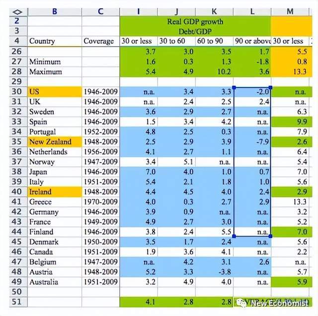 在这张Excel电子表格中,20 个国家的原始数据以反向字母顺序出现在表格的 30 至49 行。“我单击单元格 L51,发现它们仅对第 30 至 44 行进行平均,而不是对第 30 至 49 行进行平均”。这是一个Excel编码错误,这导致他们忽略了五个国家(澳大利亚、奥地利、比利时、加拿大和丹麦)。其中,三个国家(奥地利、比利时和加拿大)存在债务/GDP大于 90% 的时间段;在这些年份里,三个国家的增长率都是正值。这三个与论文结论相反的例子都被排除在了RR的计算之外。
