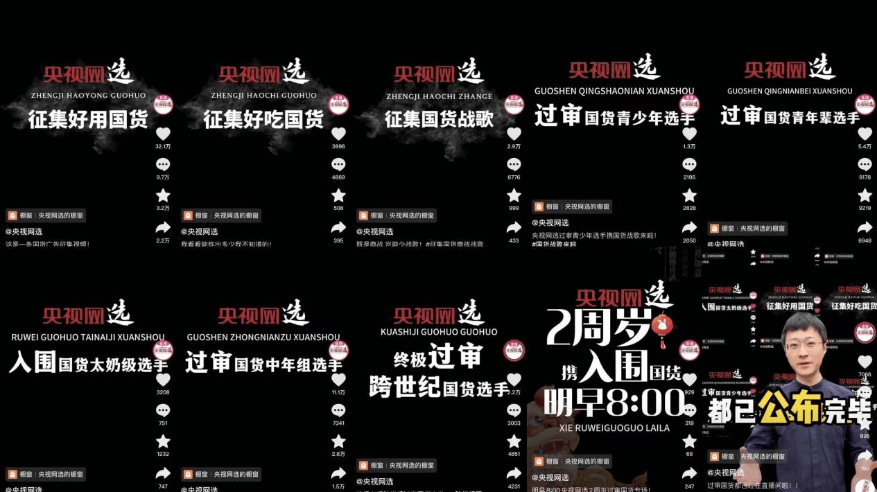同样在9月下旬助力国货品牌取得良好成绩的媒体,还有央视网官方电商平台账号“央视网选”。央视网选借力热点,前期通过短视频征集国货,与品牌评论互动,后期征集近百家国货品牌落地专场直播,并与商家连麦互动,大幅度提升了品牌的国民感知。数据显示,热点活动期间,央视网选最高单条短视频播放量超1600万,点赞量约32万,评论量破10万。