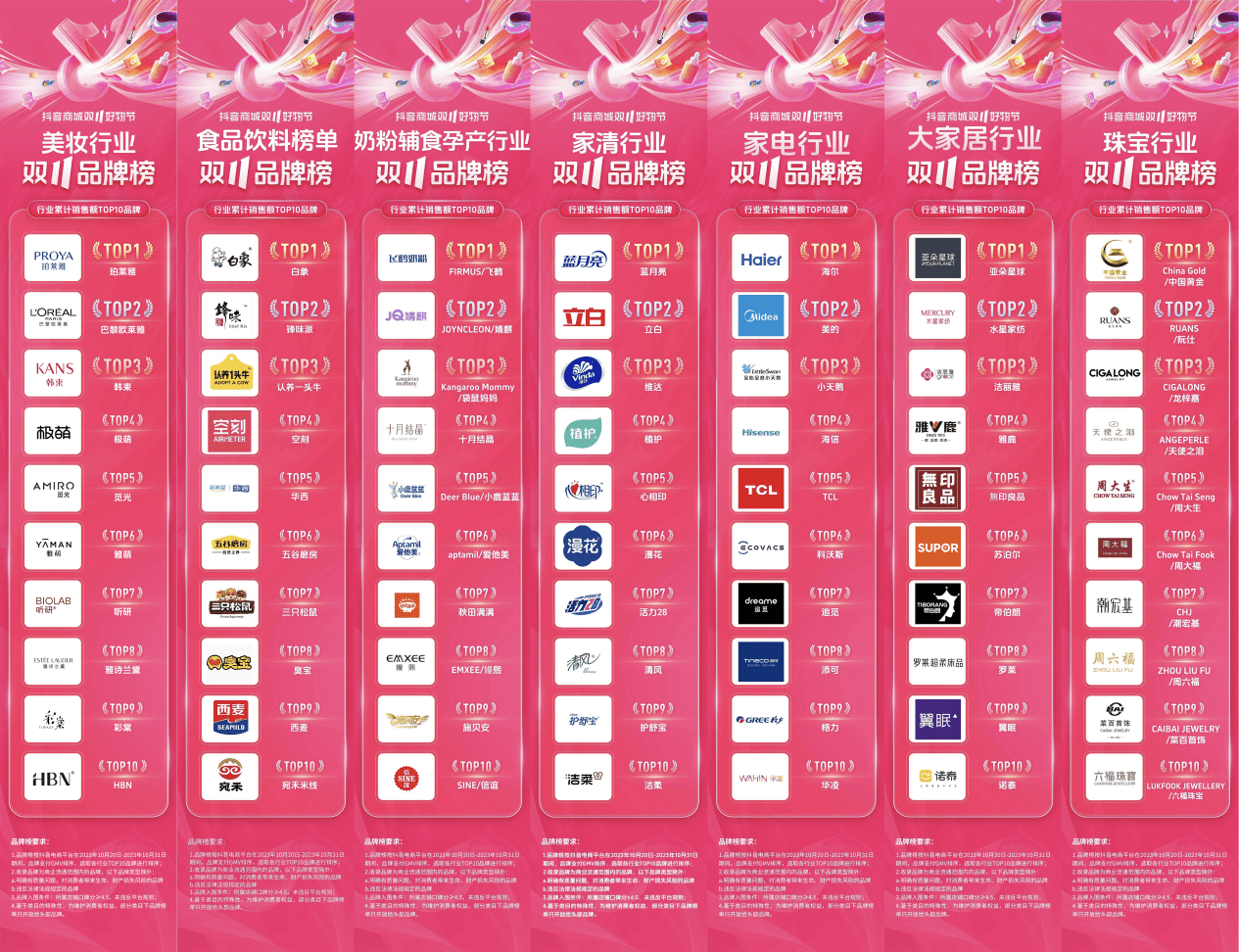 鞭牛士 11月20日消息,今年双11大促期间,众多国货品牌表现亮眼。根据抖音商城双11好物节品牌榜,10月20日至10月31日,美妆、食品饮料、奶粉辅食孕产、家清、家电、大家居、珠宝等行业多榜单TOP1均由国货品牌登顶,如珀莱雅、白象、飞鹤、蓝月亮、海尔、亚朵星球、中国黄金等。国货品牌频频出圈及其产品销量爆发的背后,体现了消费者对国内本土品牌的认可和支持。