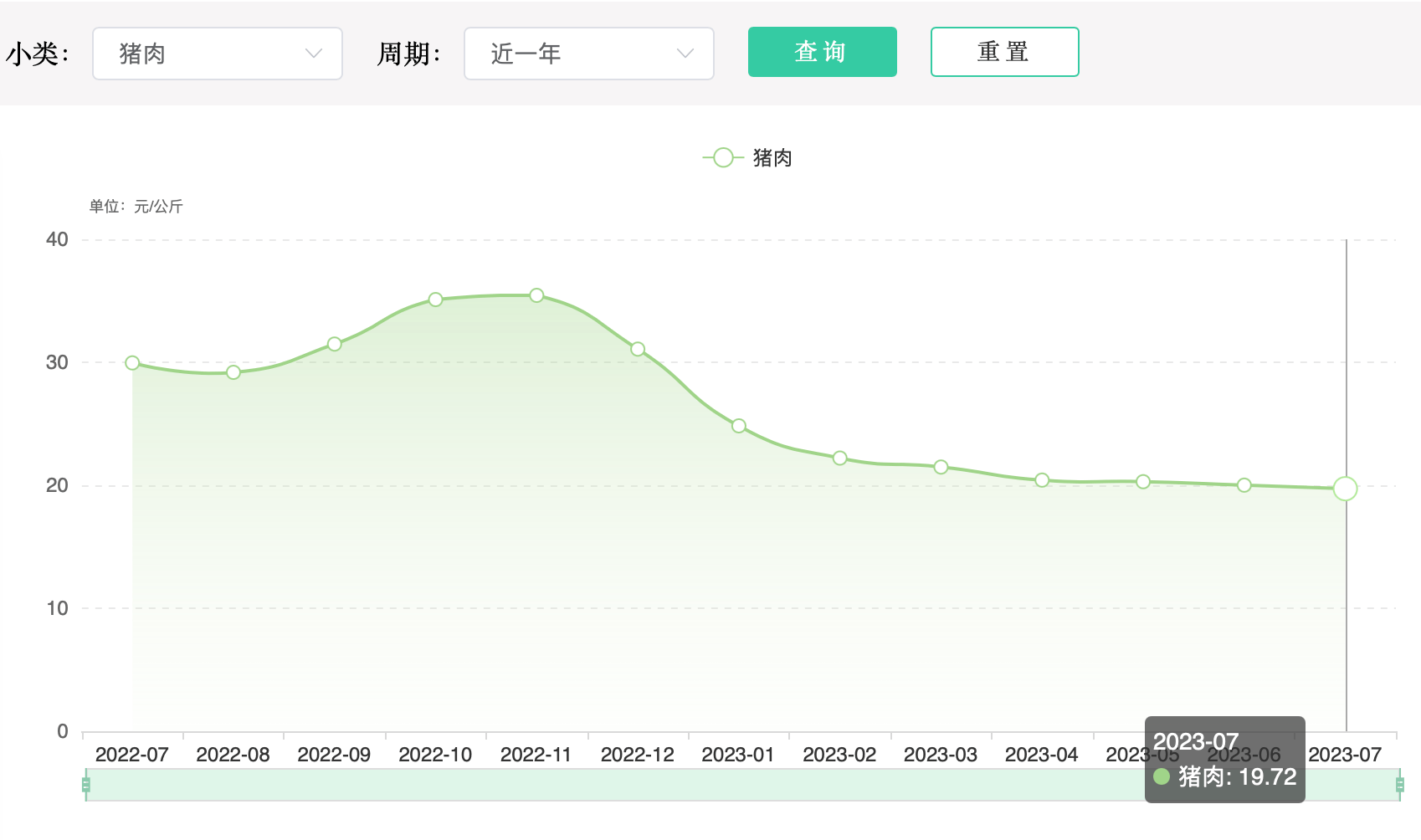 农业农村部的数据显示,自2022年11月以来,猪肉价格连续下跌,最新猪肉价格为19.72元\公斤,较去年11月的35.44元\公斤,接近腰斩。5月份规模以上生猪定点屠宰企业屠宰量为2807万头,环比降少1.9%,但同比增加了11.0%。