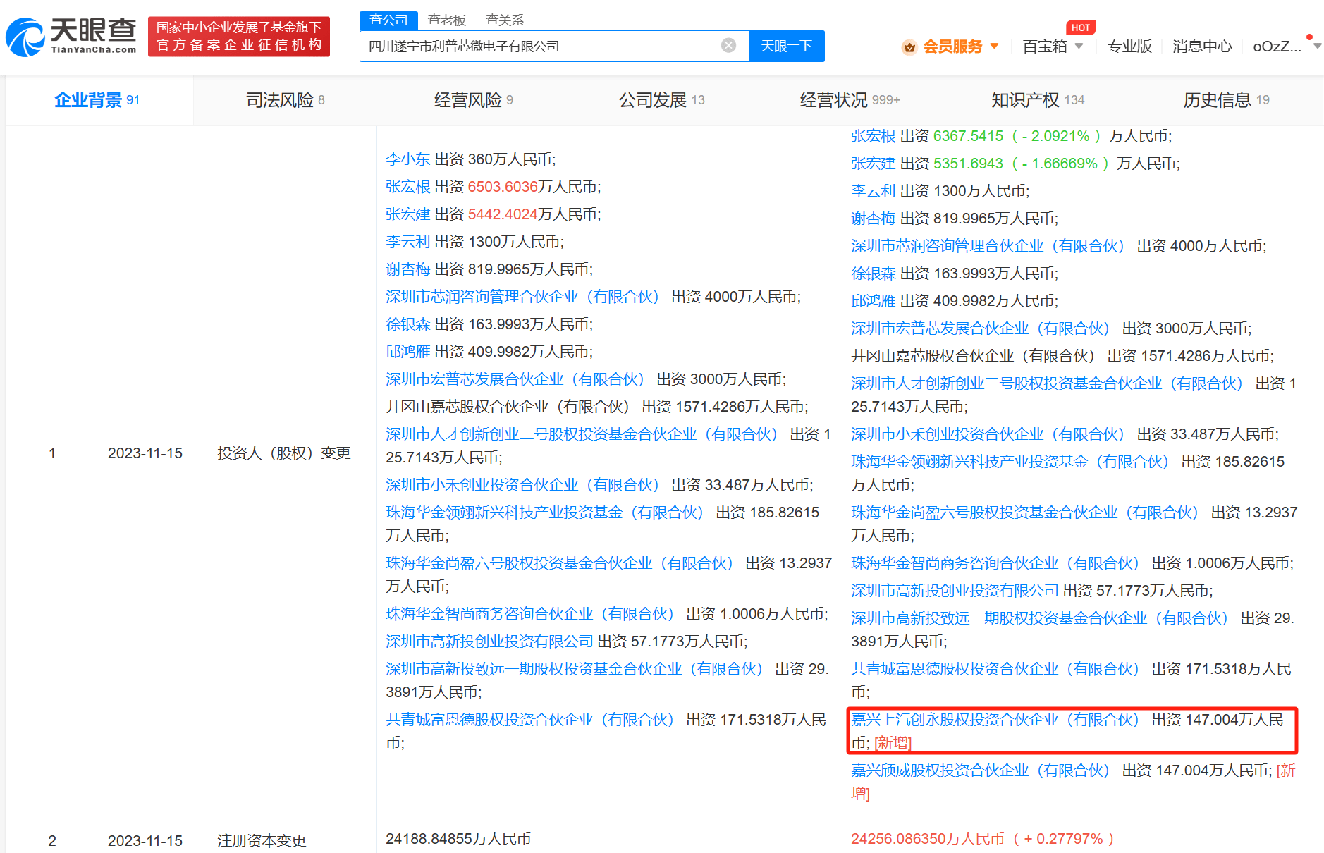 天眼查App显示,近日,四川遂宁市利普芯微电子有限公司发生工商变更,新增上汽旗下嘉兴上汽创永股权投资合伙企业(有限合伙)、嘉兴颀威股权投资合伙企业(有限合伙)为股东,同时公司注册资本增至约2.43亿人民币,增幅约0.28%。