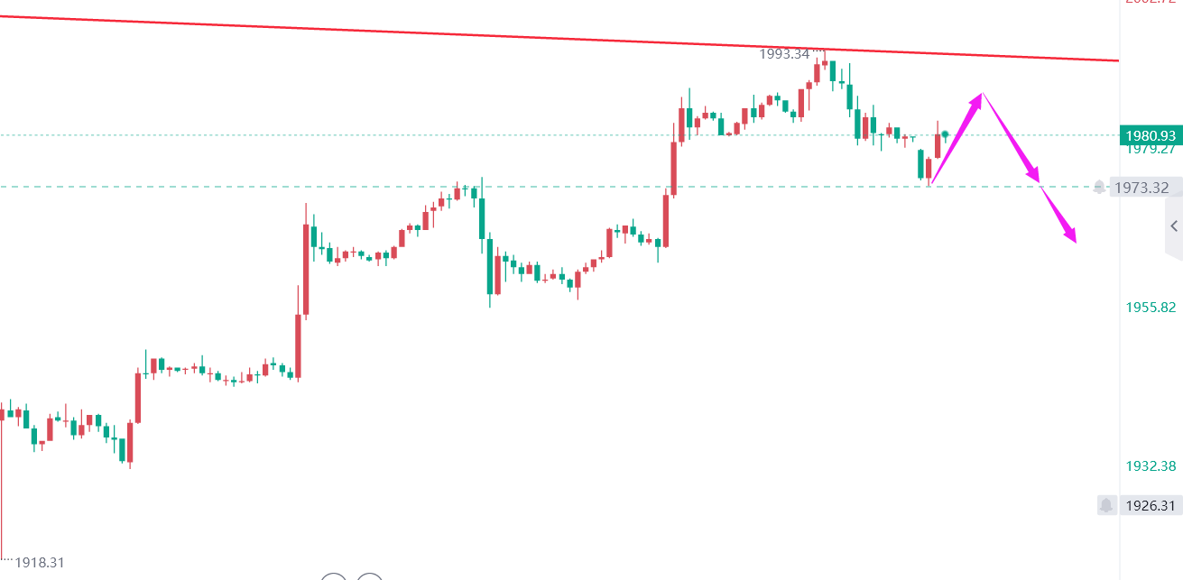 黄金操作建议:上方初次触及1987看短空即可,下方回撤1970附近做多,止损1965,目标看1987附近;