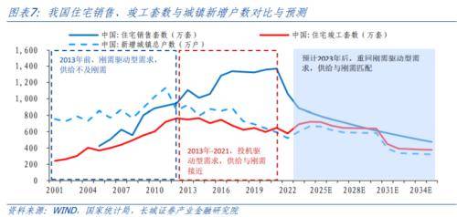从人口周期看:未来随着城镇化进城的持续放缓,地产市场可能会重新回到刚需驱动,供给与刚性需求逐步匹配。我们测算,若在2030年之前实现住宅销售套数与住宅竣工套数的基本匹配,对应住宅销售套数大致可能需按照每年-5%的增速发展。