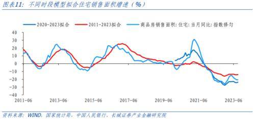 我们在2022年10月发布的报告《本轮房地产组合政策效果如何?》中也已指出,实际房贷利率和居民贷款增速这两个指标在解释商品房销售面积增速方面有较强影响。鉴于疫情发生之后中国经济发生了改变,部分数据统计口径发生变化。比如2021年下半年之后住户贷款增速与实际住宅利率走势发生了较大的背离,主要原因是房价波动变小了(这也或许也影响到货币政策上);又如国家统计局在2023年1-4月份全国房地产市场基本情况附注中解释,房地产开发投资、商品房销售面积等指标的增速均按可比口径计算。