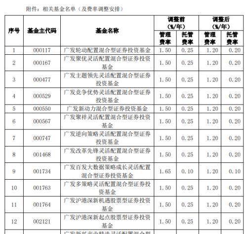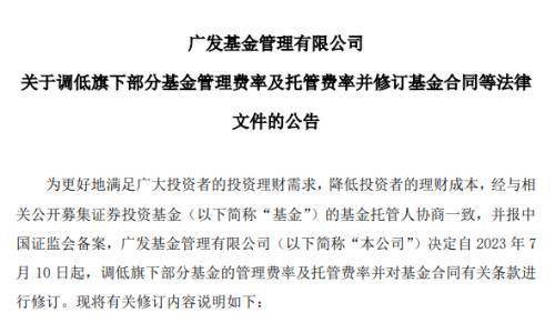 7月8日,广发基金公告称,为更好地满足广大投资者的投资理财需求,降低投资者的理财成本,自7月10日起,调低旗下部分基金的管理费率及托管费率并对基金合同有关条款进行修订。