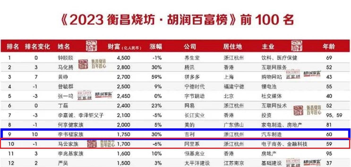 根据最新发布的《2023年胡润百富榜》数据显示,李书福家族的财富已经超过了马云家族,以1750亿元的资产位列全国第九。