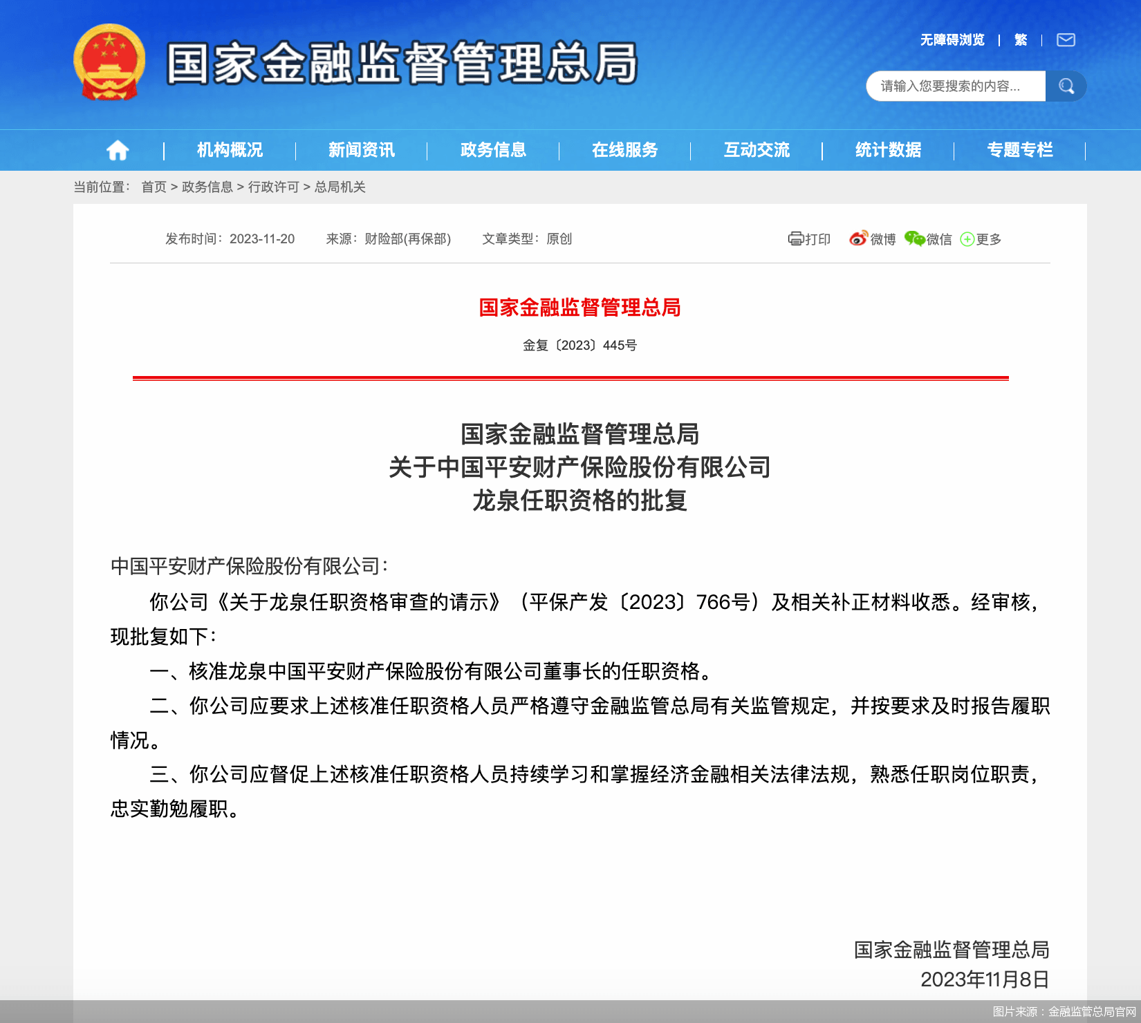 原标题:龙泉获批担任平安产险董事长