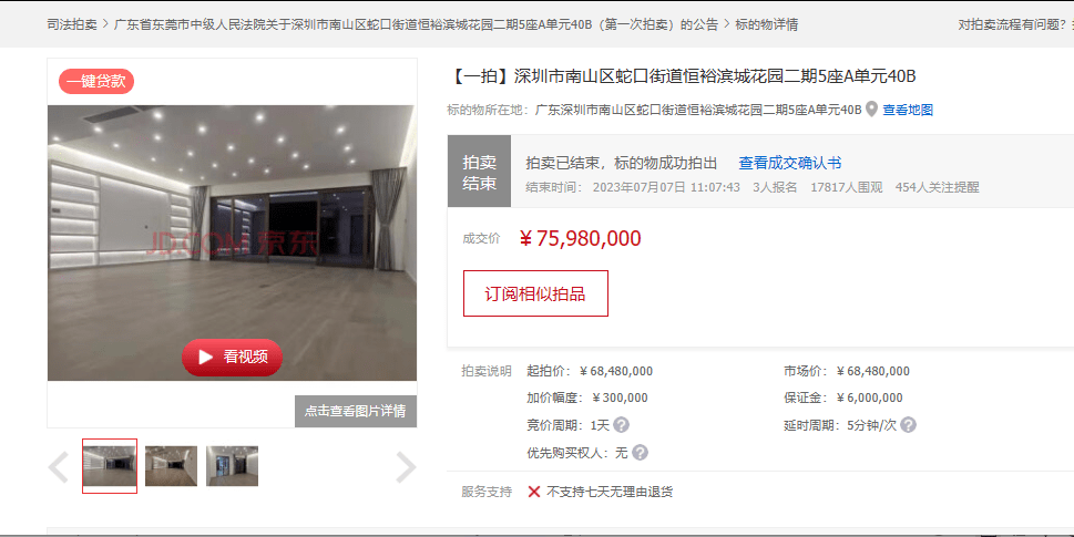 记者梳理发现,2023年5月9日至5月10日,广东省东莞市中级人民法院在京东网络司法拍卖平台上,对这套恒裕滨城花园二期5座A单元40B进行公开拍卖,当时的起拍价为1.07亿元。有业内人士表示,该套住宅的建筑面积278.58平方米,按照起拍价折合建筑面积初步计算,每平方米价格为38.41万元,或为深圳法拍住宅最高单价,后一拍因无人出价而流拍。二拍起拍价打8折降至8560万元后再次流拍;三拍起拍价再打8折降至6848万元,本轮法拍吸引了3人报名,近2万人围观,在经历26次出价后,该套房源最终以7598万元总价成交。