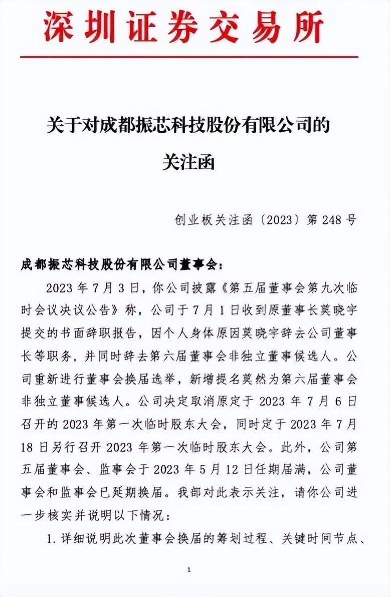 7月7日,深圳证券交易所下发关于对成都振芯科技股份有限公司(以下简称“振芯科技”或“公司”)的关注函。关注函要求振芯科技说明公司此次董事会换届的筹划过程、关键时间节点、公司及相关方在筹划期间所做的主要工作;说明是否存在其他导致在短期内重新进行董事会换届选举的原因;说明相关董事、监事候选人提名过程是否符合公司法、公司章程和有关制度的相关规定;结合莫然的个人情况、专业能力、任职经历、与莫晓宇的具体关联关系等信息,进一步说明提名的理由,是否具备相应的胜任能力等。