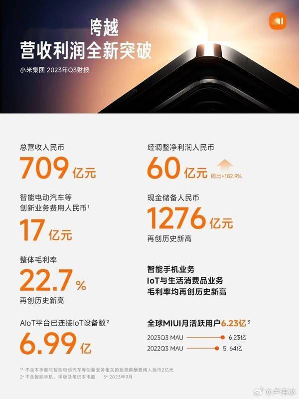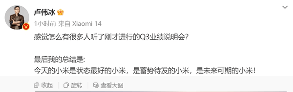 【CNMO新闻】11月20日,小米集团发布了2023年第三季度财报。报告期内,小米实现营收708.94亿元,同比增长0.6%,净利润为48.69亿元,较去年同期的净亏损14.74亿元扭亏为盈。晚些时候,CNMO注意到,小米集团合伙人、总裁,国际部总裁,Redmi品牌总经理卢伟冰发文称,感觉怎么有很多人听了刚才进行的Q3业绩说明会?他还表示:今天的小米是状态最好的小米,是蓄势待发的小米,是未来可期的小米!