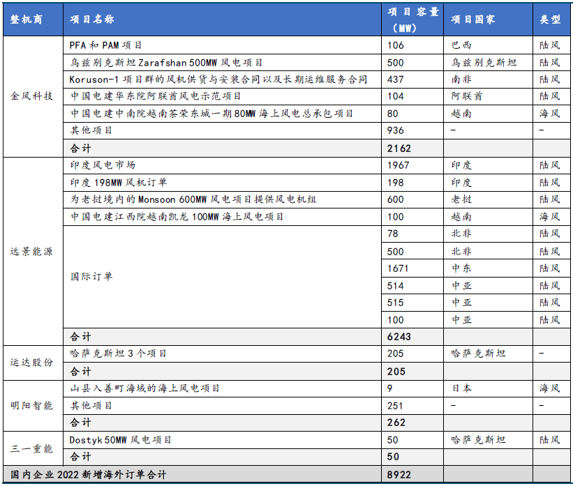 据国金证券姚遥4月8日研报中统计,2022年国内风电整机企业新增海外订单接近9吉瓦,分布范围包括有东南亚、欧洲、北非、中东、中亚等区域。国内主要出海风电整机制造商集中在金风科技、远景能源、运达股份、明阳智能、三一重能这几家龙头公司身上。其中,远景能源海外订单规模最为突出,中标风电项目总装机规模超过6000兆瓦,占中国企业海外项目订单的比例超过70%,成为了海外表现最为亮眼的中国风机制造商。