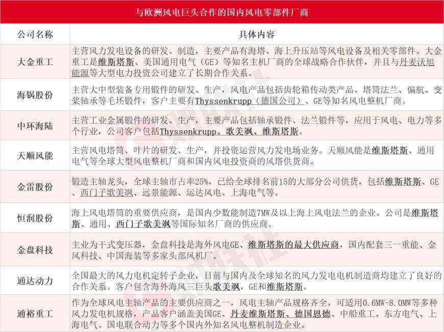 中国作为全球最大的海上风电市场培育了完善的海风制造产业链,海风零部件企业已“深入老巢”,供货欧洲风电巨头。据财联社此前不完全梳理,大金重工、海锅股份、中环海陆、天顺风能、金雷股份、恒润股份、金盘科技、通达动力和通裕重工等国内风电零部件厂商均与欧洲知名主机厂商有所合作,具体情况如下: