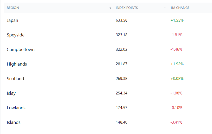 从产区来看,日本威士忌的价格指数在6月表现不错, 上涨了1.55%,而高地产区则 上涨了1.92%,为此次涨幅最高的一个产区。