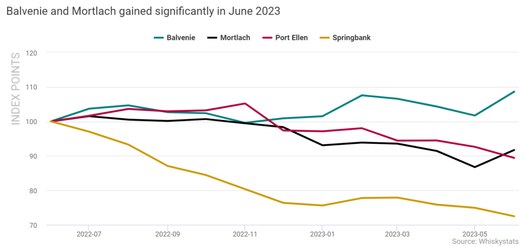 其中,百富玫瑰(Balvenie Rose 2nd Bottling)在5月的价格跌至2300欧元,但在6月份,其价格上涨至2800欧元。不过,这对于一个口碑极佳的品牌来说确实是没有太大的意外。