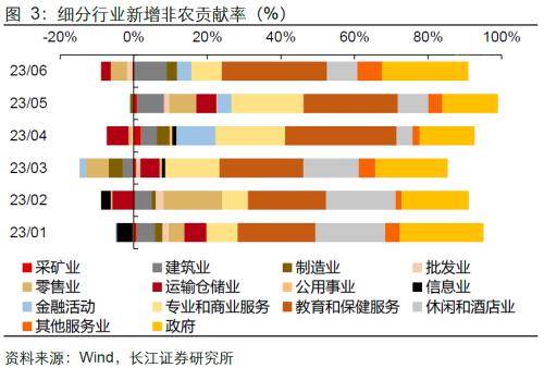 其中服务业人数较上月少增11.6万人是主要拖累,批发、零售、运输仓储业劳动力供给减少,较上月少增0.8万、3.4万、2.4万人,此前增长较快的专业商业服务也明显放缓,本月仅新增2.1万人。制造业尤其是耐用品制造业以及政府部门劳动力供给修复加快,较上月分别多增1.1万、1.3万人。