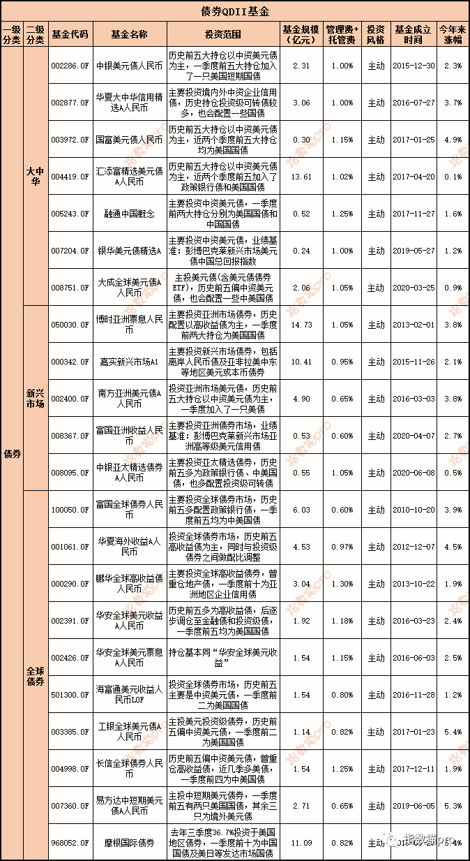 最后一部分是投资全球债券市场,其中 有几只是主投非中资美元债的QDII基金。