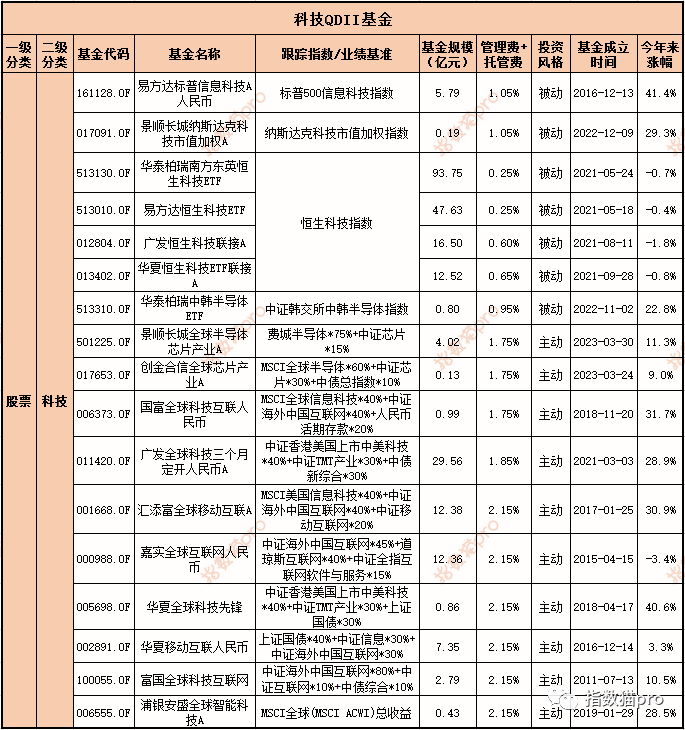 表格里面,前面两只被动基金—— 易方达标普信息科技A人民币、 景顺长城纳斯达克科技市值加权A跟踪的都是美股科技指数。