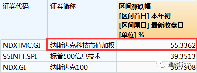 而且,景顺这只基金跟踪的指数—— 纳斯达克科技市值加权指数,今年来的涨幅(55%)比纳斯达克100指数(37%)和标普500信息科技指数(39%)还要高。