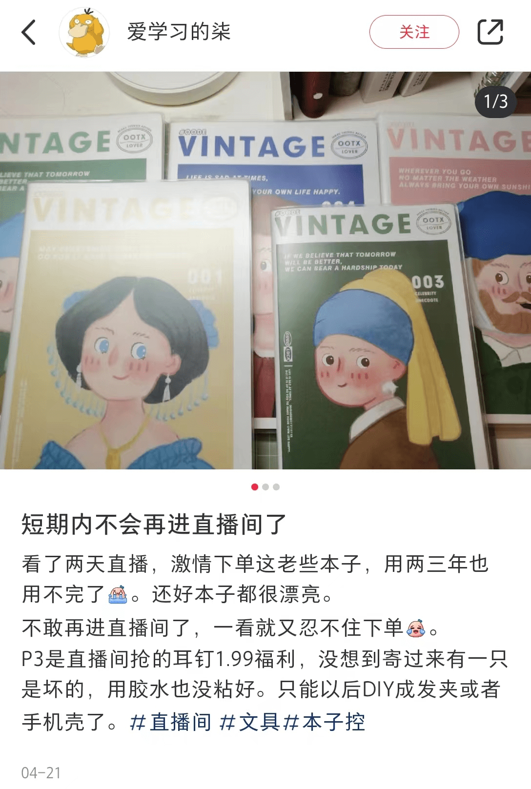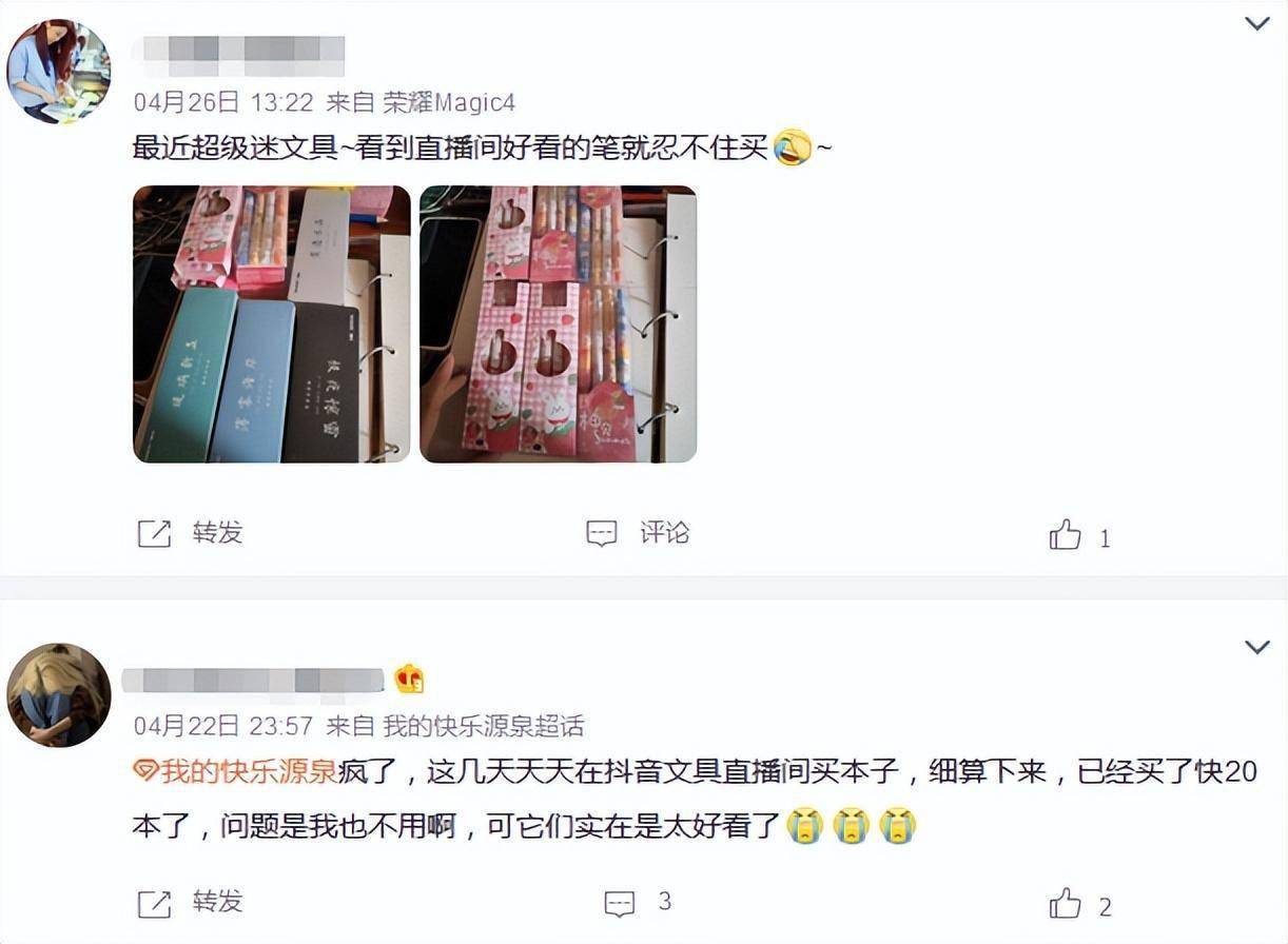 凌晨4点,还没睡觉的豆友发帖感叹:“在文具直播间真的很容易冲动购物,短短五天,买了一百多个本子和将近两百根笔”。