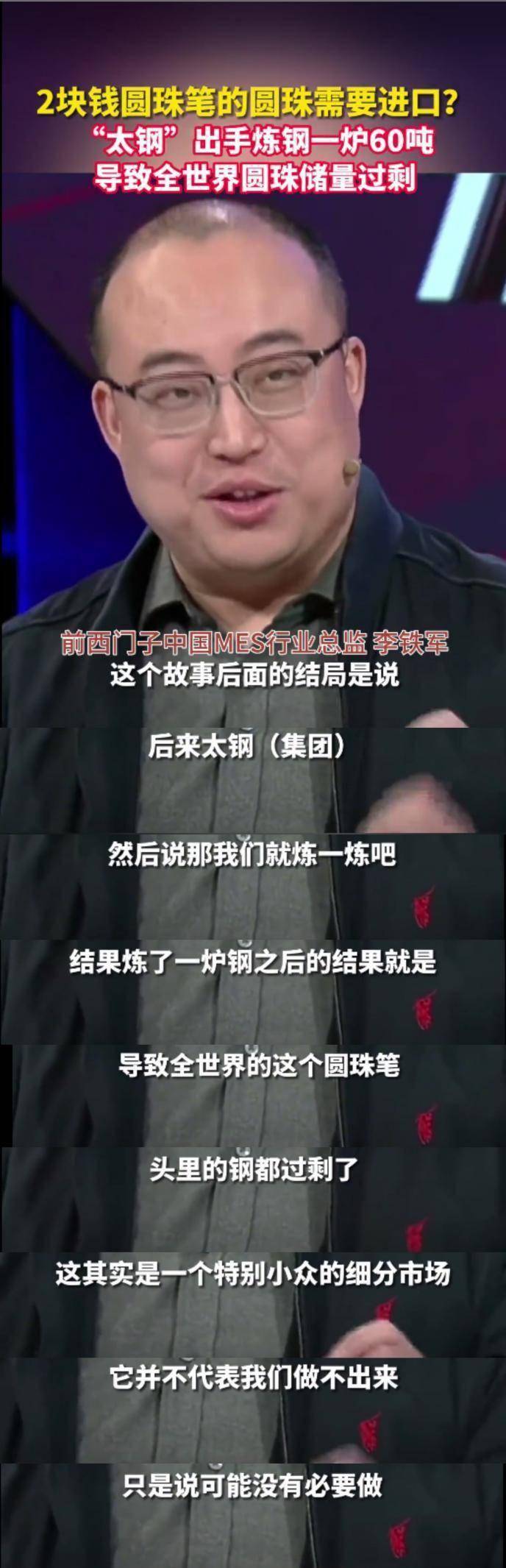 “2块钱圆珠笔的圆珠都造不出来需要进口”的故事流传太广,结果信以为真的太钢集团一出手,炼了一炉60吨的钢,导致全世界圆珠储量过剩。