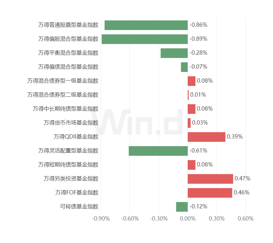 偏股混合型基金指数、普通股票型基金指数、灵活配置型基金指数表现不佳,收益率分别为:-0.89%、-0.86%、-0.61%。