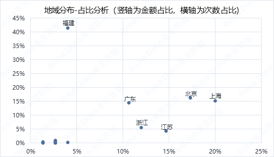本周地域分布情况如下:融资事件数前五地区依旧是上海、北京、江苏、浙江和广东,前五合计发生融资事件56起,占比74.67%,融资事件数上地域集中度较上周有所上升;金额方面,本周前五地区为福建、北京、上海、广东和浙江,前五合计融资规模103.83亿元,合计占比93.36%,本周福建和北京之所以能位列前二,前者主要受海辰储能融资的影响,后者主要受先通医药融资的影响。