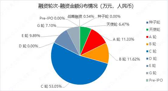 从融资轮次的分布次数来看,本周天使轮和A轮依旧是最活跃轮次,两者合计达47起,合计占比为62.67%,另外中后期融资案例数(B轮至Pre-IPO)有20起,较上周增加了5起。融资金额方面,本周C轮融资金额占比最高,达53.05%,不过主要是受超大金额融资事件的影响;其次是A轮和B轮,两者占比均在11%左右。整体来看,轮次分布上集中度较上周继续上升。