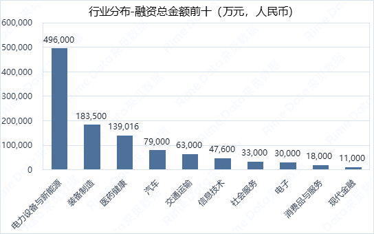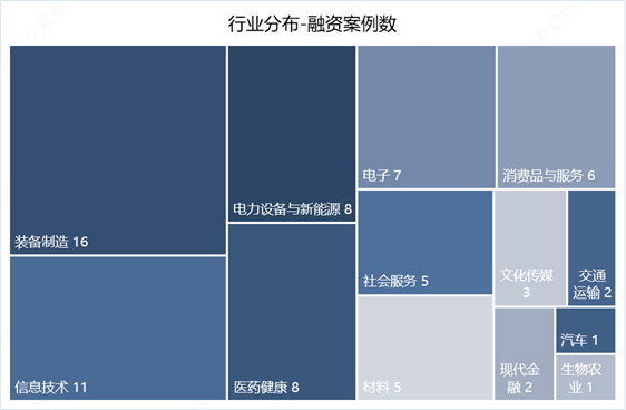 本周融资事件共涉及到13个行业,融资案例数前五是装备制造、信息技术、电力设备与新能源、医药健康和电子,合计融资事件50起,合计占比达66.67%,融资案例数上行业集中度较上周有所下降。