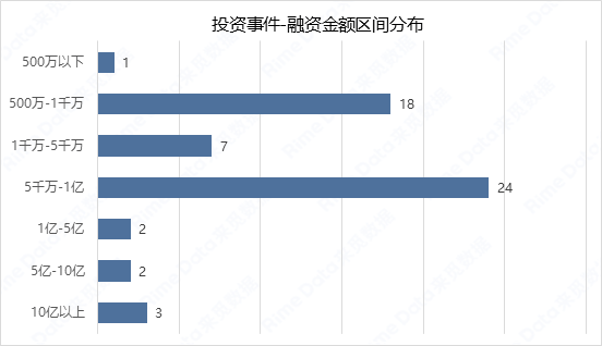 本周已披露融资金额事件57起,融资金额区间分布如下:整体分布结构较上周有一定变化,5000万-1亿(含1亿)成为融资事件最为集中的区间,合计24起,集中度第二高的区间是500万-1000万(含1000万),合计18起。另外本周有3起10亿元以上融资事件,较上周增加了2起。