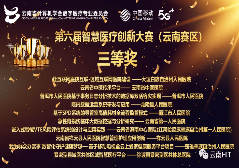 近日,由云南省计算机学会数字医疗专业委员会主办的第六届智慧医疗创新大赛云南赛区决赛在云南普洱成功举办。云南省中医医院/云南中医药大学第一附属医院喜获第六届智慧医疗创新大赛云南赛区三等奖。