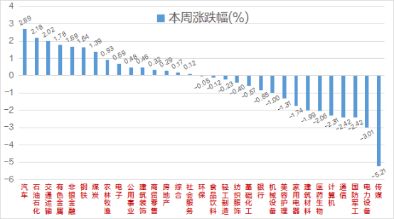 全周维度来看,申万31个一级行业中15个行业录得上涨,汽车以2.69%的周涨幅领跑,石油石化、交通运输涨幅也超过2%,有色金属、非银金融、钢铁、煤炭等涨超1%,农林牧渔、电子、公用事业等小幅上涨;AI主题调整,传媒板块遭重挫,周跌幅超过5%,电力设备跌超3%,国防军工、通信、计算机、医药生物等跌逾2%。