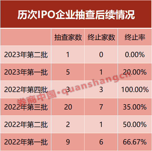 随着时间步入今年,1月中国证券业协会共抽中5家IPO企业,后来有1家终止。第二批抽中1家,未出现撤材料的情况。