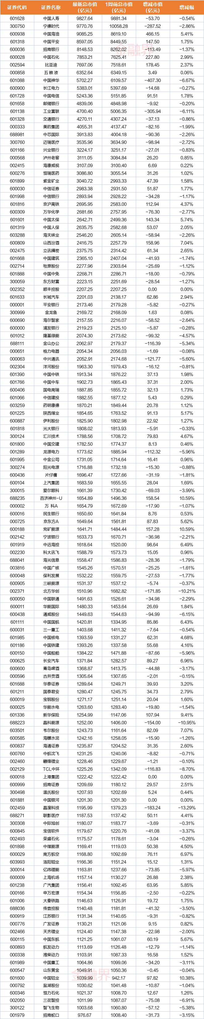中国神华周市值大降407.3亿元,工业富联市值本周蒸发305.94亿元,宁德时代市值蒸发超过287亿元,晶澳科技市值蒸发183.24亿元,北方华创、晶科能源、中兴通讯、TCL中环、金山办公、招商银行均减少超100亿元。