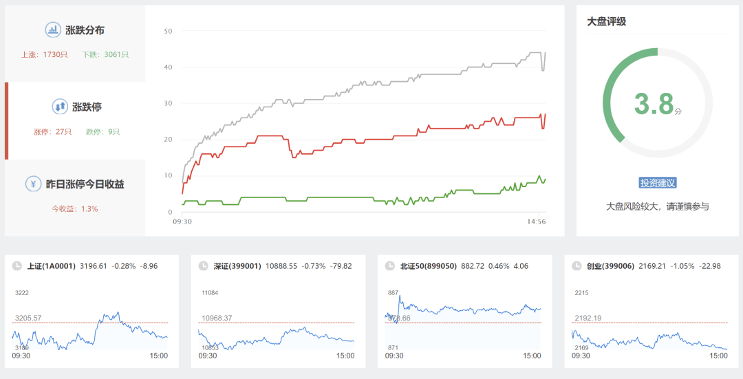 从大盘来看,截止收盘,沪指下跌0.28%,收3196.61点;深成指下跌0.73%,报收10888.55点;创业板下跌01.05%,收2169.21点。