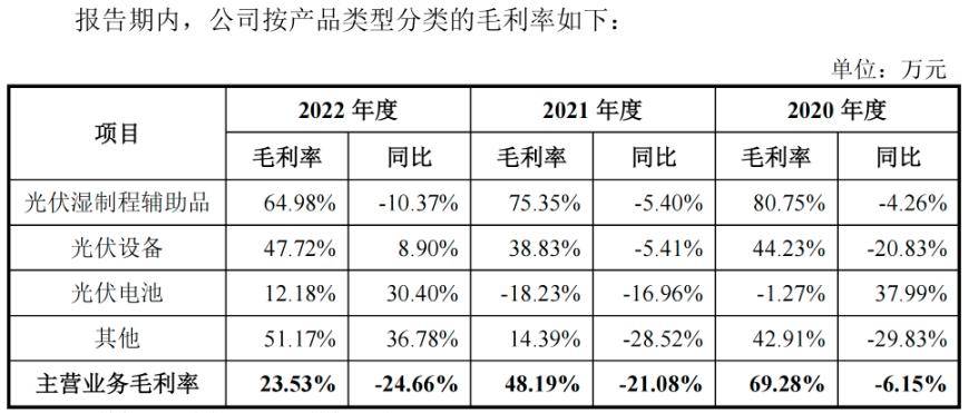 根据招股资料显示,光伏电池2020-2022年毛利率分别为-1.27%、-18.23%、12.18%,其毛利率大幅波动加上营收占比增加,使得公司主营业务毛利率各期为69.28%、48.19%、23.53%,呈现大幅下滑趋势。