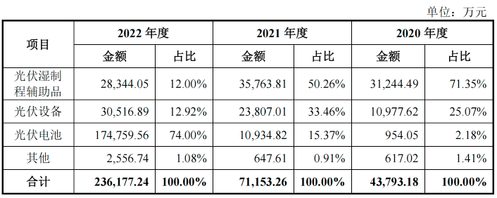2020-2022年,公司光伏湿制程辅助品分别实现营业收入3.12亿元、3.58亿元和2.83亿元。其中2022年,公司相关产品的平均销售单价同比下降30.87%,销售数量同比上升14.64%,导致销售收入同比下降20.75%。