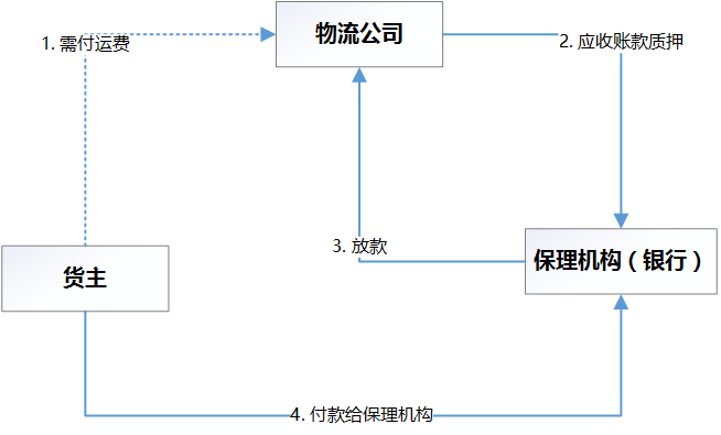 比如以下的示例中,对于物流企业来说,有运费的收入,但收入有3个月的账期,此时物流公司可以把应收账款质押给保理机构,保理机构针对3个月账期后要收的钱,提前放款给物流公司,然后3个月货主再支付给保理机构。