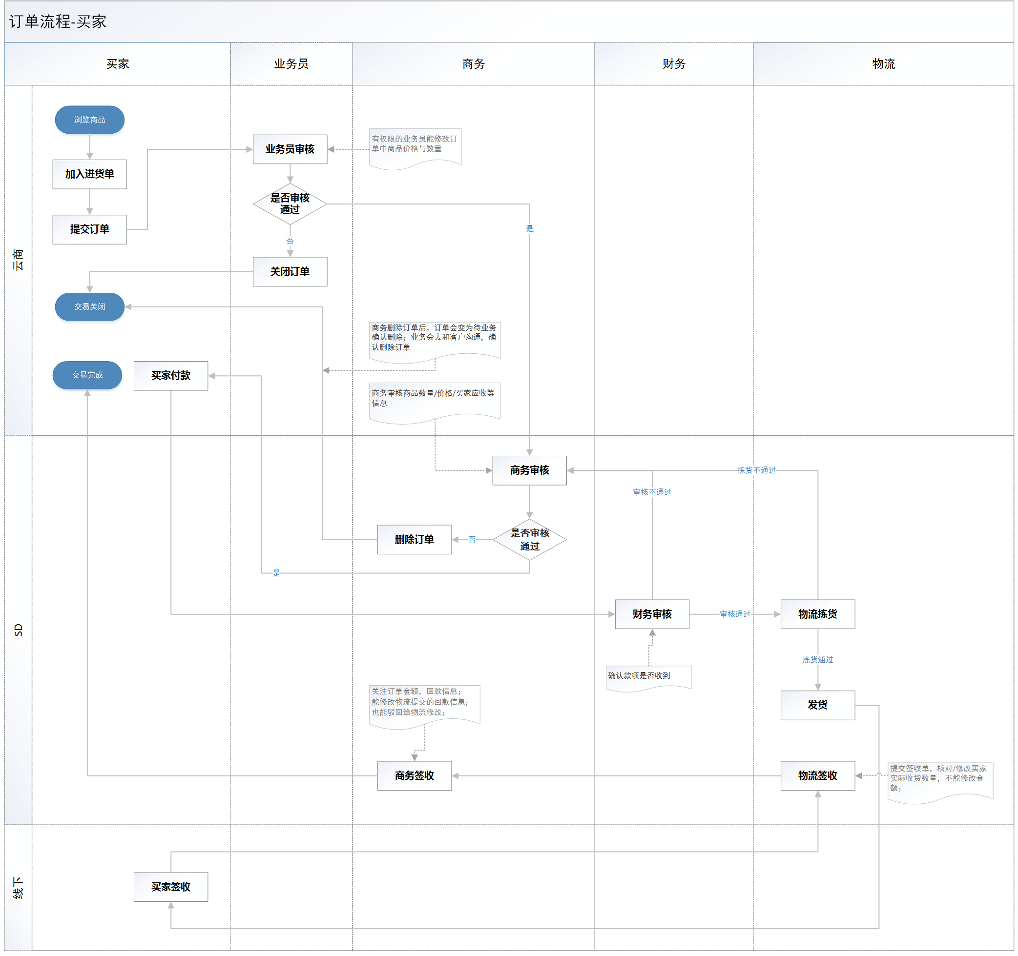 如以下示例,是曾经前东家买家下单的流程,买家下单后会经过业务员、商务、以及财务环节的多重审核。只是实际流程中审核过程会很快,流程逐步标准化后,各环节也会有自动审单: