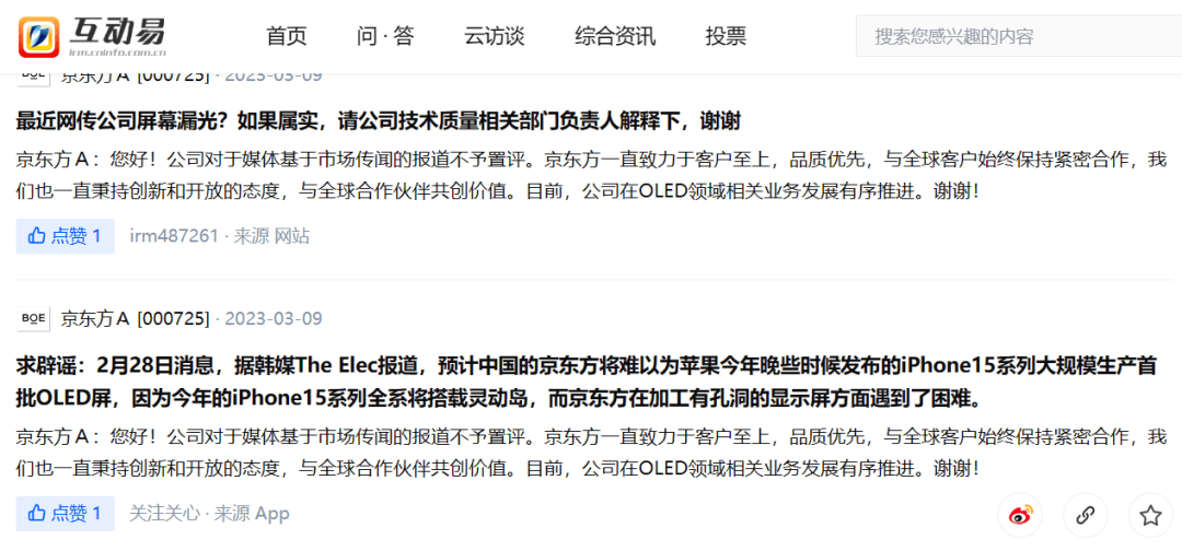 消息一出,市场一片哗然,还有投资者在互动易平台要求公司辟谣,而针对投资者疑问,京东方A统一回复称,公司对于媒体基于市场传闻的报道不予置评。
