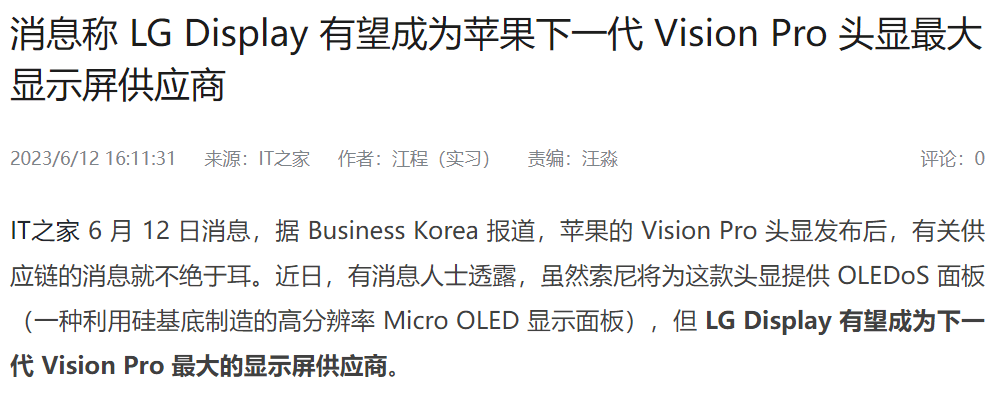 有消息称,苹果Vision Pro目前所使用的高分辨率 Micro OLED 显示面板,首批由索尼独家供应。亦有消息人士透露,从第二代开始,LG Display有望成为Vision Pro最大的显示屏供应商。据悉,LG Display自2020年以来一直在测试微型OLED面板,为扩展XR市场做准备。