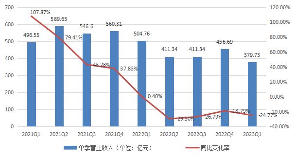 2021Q1-2023Q1京东方单季营业收入及其变化率,数据来源:京东方财报