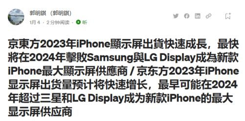 在今年1月4日,分析师郭明_发推文爆料:京东方已击败三星,取得今年下半年新款iPhone 15与15 Plus大部分显示屏订单。若未来数个月开发与生产顺利,京东方将斩获 iPhone 15与15 Plus,成为苹果今年最大的屏幕供应商,供应比重约70%。
