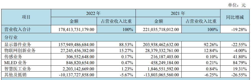 京东方2021年和2022年的营业收入构成情况,来源:京东方年报