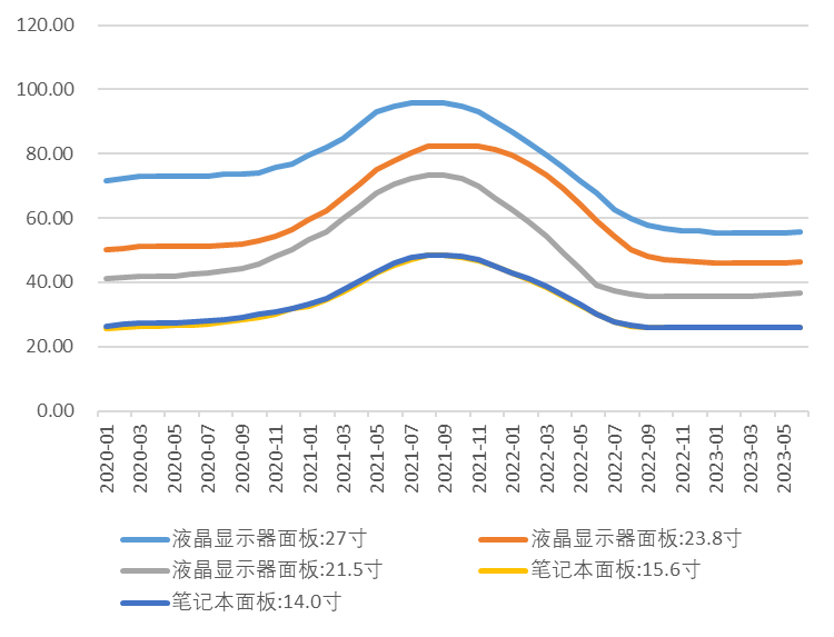 2020M1-2023M5全球液晶显示屏和笔记本面板价格走势(单位:美元/片),数据来源:Wind