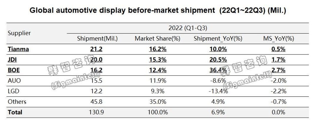2022年前三季度全球车载显示屏市场份额情况,来源:群智咨询
